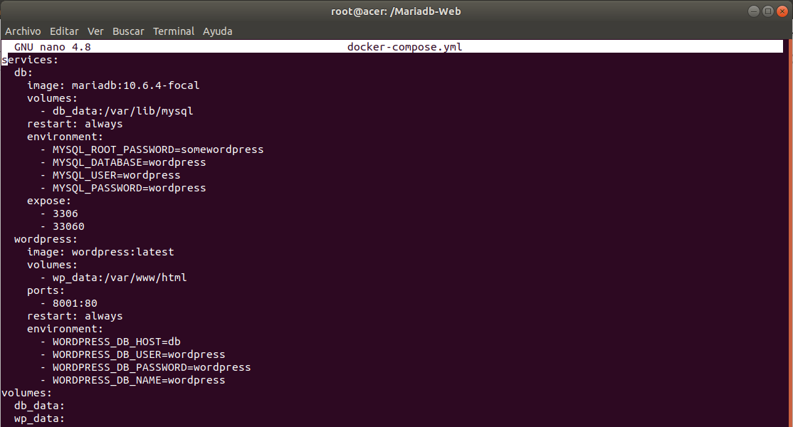 - In: root@acer:/Mariadb-Web# nano docker-compose.yml