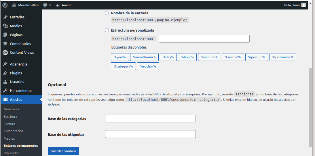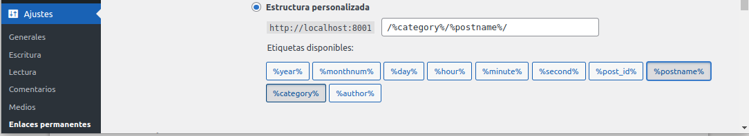 -. Estructura Personalizada del sitio-Web, con las etiquetas %category% y %postname% y ¡cliquear sobre Guardar cambios!