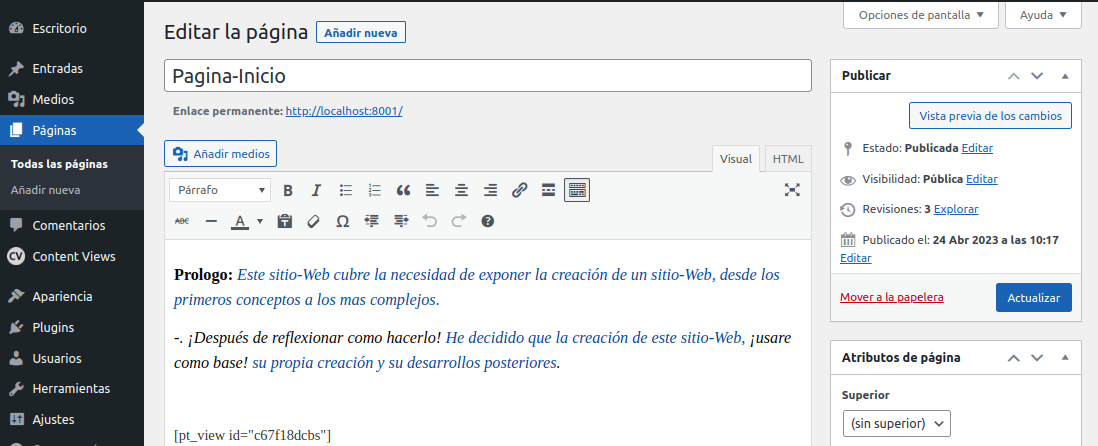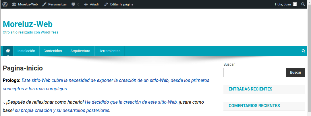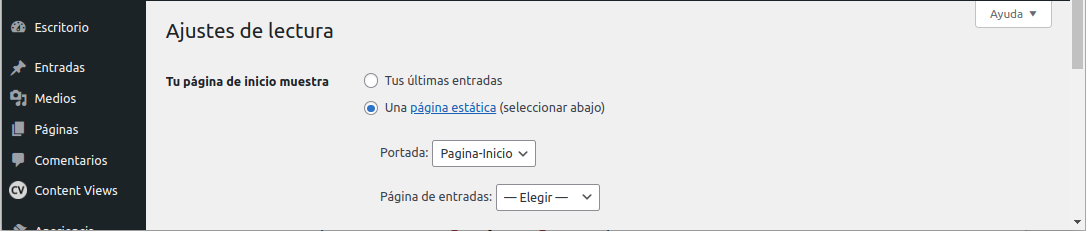 Nota: Si tenemos una pagina que nos interesa usarla como Pagina-Inicio podemos seleccionar en Escritorio / Ajustes / Lectura / Ajustes de Lectura ¡cliquear sobre pagina estática! Y seleccionamos la que deseamos.