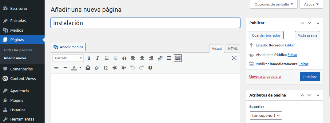 -. A continuación creamos una pagina con la primera palabra clave “Instalación” ¡cliquear sobre Añadir nueva!