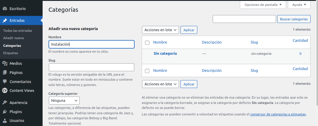 -. A continuación creamos una categoría ponemos el nombre “Instalación” ¡cliquear sobre Añadir una nueva categoría!