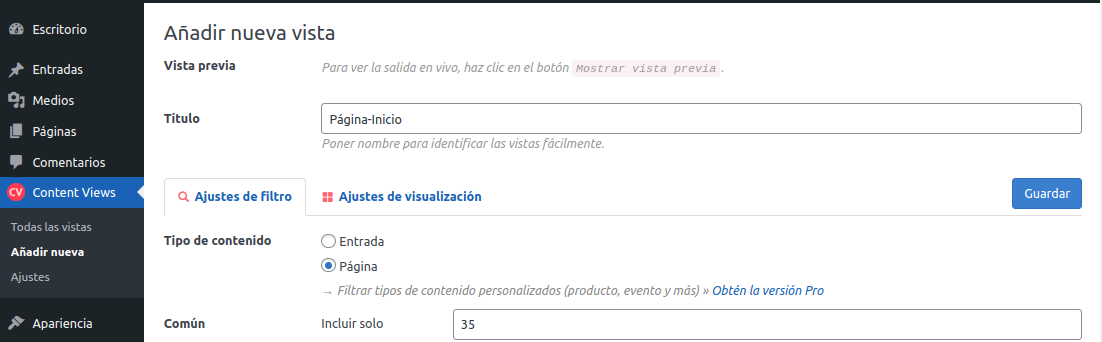 Titulo Página-inicio, Tipo de contenido Pagina y Numero de pagina 35, ¡cliquear sobre Guardar!