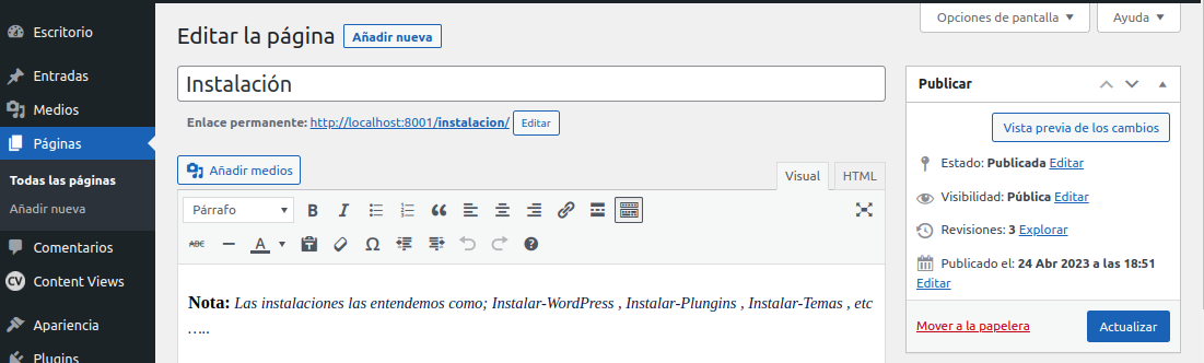 -. Editemos la pagina-35-Instalación, agregar una nota un prologo y la imagen creada por nosotros ¡cliquear sobre Actualizar!