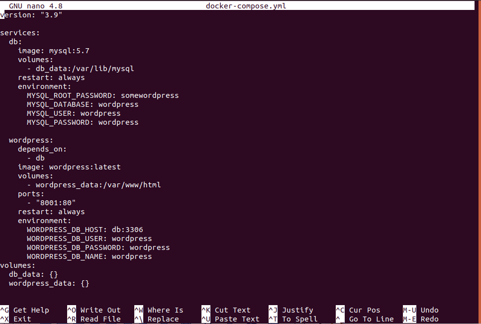 -. Creamos la Instancia-Web, en este caso “WordPress” tenemos arrancar el editor -Nano con con un fichero nombrado como docker-compose.yml el situado en :/Moreluz-Web. Y copiamos el siguiente testo.